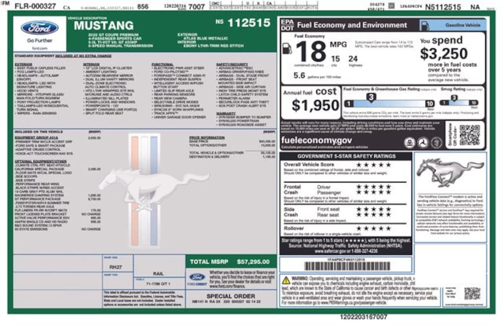 2022 Ford Mustang GT Premium 5.0L V8 Ti-VCT 6-Speed Manual RWD 2D Coupe Atlas Blue Metallic