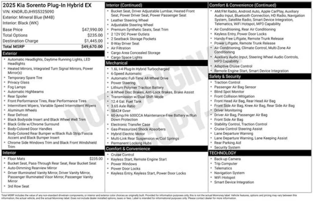 Experience the perfect balance of efficiency, technology, and style with this 2025 Kia Sorento Plug-In Hybrid EX. Schedule a test drive today and discover the exceptional value and peace of mind that comes with this Kia Certified Pre-Owned vehicle.