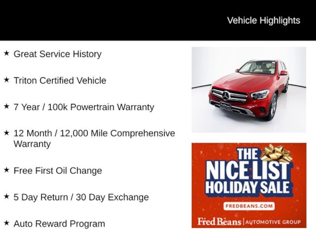 2021 Mercedes-Benz GLC 300 4MATIC® GLC 300 I4 9-Speed Automatic 4MATIC® 4D Sport Utility Cardinal Red Metallic Great Service History, Triton Certified Vehicle, 7 Year / 100k Powertrain Warranty, 12 Month / 12,000 Mile Comprehensive Warranty, Free First Oil Change, 5 Day Return / 30 Day Exchange, Auto Reward Program.