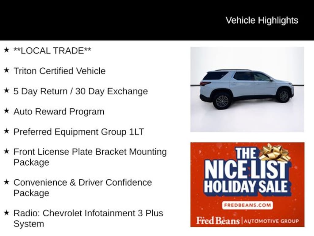 **LOCAL TRADE**, Triton Certified Vehicle, 5 Day Return / 30 Day Exchange, Auto Reward Program, 4.2" Multi-Color Enhanced Driver Instrument Display, Convenience & Driver Confidence Package, Exterior Parking Camera Rear, Front dual zone A/C, Front License Plate Bracket Mounting Package, Heated Driver & Front Passenger Seats, Preferred Equipment Group 1LT, Radio: Chevrolet Infotainment 3 Plus System, Rear Power Liftgate, Remote Start, Universal Home Remote, 2-Way Manual Front Passenger Seat Adjuster, 3.49 Axle Ratio, 3rd row seats: split-bench, 4-Wheel Disc Brakes, 6 Speakers, 6-Speaker Audio System Feature, 8-Way Power Driver Seat Adjuster, ABS brakes, Air Conditioning, Alloy wheels, AM/FM radio: SiriusXM, Apple CarPlay/Android Auto, Auto High-beam Headlights, Automatic temperature control, Black Roof Rails, Brake assist, Bumpers: body-color, Compass, Delay-off headlights, Driver door bin, Driver vanity mirror, Dual front impact airbags, Dual front side impact airbags, Electronic Stability Control, Emergency communication system, Four wheel independent suspension, Front anti-roll bar, Front Bucket Seats, Front Center Armrest, Front reading lights, Fully automatic headlights, Heated door mirrors, Illuminated entry, Leather steering wheel, Low tire pressure warning, Not Equipped w/Rear Park Assist (060), Occupant sensing airbag, Outside temperature display, Overhead airbag, Overhead console, Panic alarm, Passenger door bin, Passenger vanity mirror, Power door mirrors, Power Driver Lumbar Control, Power driver seat, Power steering, Power windows, Premium Cloth Seat Trim, Radio data system, Radio: Chevrolet Infotainment System AM/FM Stereo, Rear air conditioning, Rear anti-roll bar, Rear reading lights, Rear window defroster, Rear window wiper, Remote keyless entry, Security system, SiriusXM Radio, SiriusXM w/360L, Speed control, Speed-sensing steering, Spoiler, Steering wheel mounted audio controls, Tachometer, Telescoping steering wheel, Tilt steering wheel, Traction control, Trip computer, Turn signal indicator mirrors, Variably intermittent wipers, Voltmeter, Wheels: 18" Bright Silver-Painted Aluminum, 4.2" Multi-Color Enhanced Driver Instrument Display, Convenience & Driver Confidence Package, Exterior Parking Camera Rear, Front dual zone A/C, Front License Plate Bracket Mounting Package, Heated Driver & Front Passenger Seats, Preferred Equipment Group 1LT, Radio: Chevrolet Infotainment 3 Plus System, Rear Power Liftgate, Remote Start, Universal Home Remote.