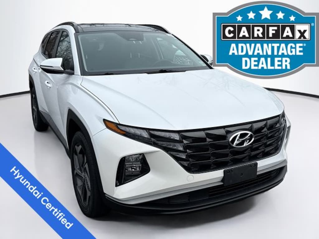 Recent Arrival! 2023 Hyundai Tucson Hybrid SEL Convenience I4 6-Speed Automatic AWD 4D Sport Utility Serenity White Pearl Factory Certified Vehicle, 5 Day Return / 30 Day Exchange, Auto Reward Program, I4, AM/FM radio: SiriusXM, Apple CarPlay & Android Auto, Auto High-beam Headlights, Auto-dimming Rear-View mirror, Automatic temperature control, Front dual zone A/C, Fully automatic headlights, Heated door mirrors, Heated Front Bucket Seats, Heated front seats, Navigation System, Power door mirrors, Power driver seat, Power Liftgate, Power moonroof, Remote keyless entry, Steering wheel mounted audio controls.
