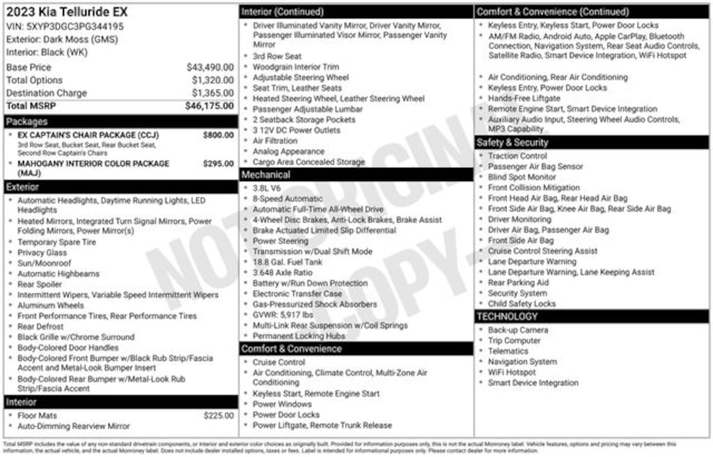 Recent Arrival! 2023 Kia Telluride EX 3.8L V6 DGI DOHC Dual CVVT 8-Speed Automatic AWD 4D Sport Utility Dark Moss Kia Certified Pre-Owned Certified, 2nd Row Captain Chairs, 3.648 Axle Ratio, 3rd row seats: split-bench, 4-Wheel Disc Brakes, 6 Speakers, ABS brakes, Air Conditioning, Alloy wheels, AM/FM radio: SiriusXM, Apple CarPlay & Android Auto, Auto High-beam Headlights, Auto-dimming Rear-View mirror, Automatic temperature control, Brake assist, Bumpers: body-color, Carpet Floor Mats, Compass, Delay-off headlights, Driver door bin, Driver vanity mirror, Dual front impact airbags, Dual front side impact airbags, Electronic Stability Control, Emergency communication system: 911 Connect, EX Captain's Chair Package, Exterior Parking Camera Rear, Four wheel independent suspension, Front anti-roll bar, Front Bucket Seats, Front Center Armrest, Front dual zone A/C, Front reading lights, Fully automatic headlights, Heated & Ventilated Front Bucket Seats, Heated door mirrors, Heated front seats, Heated steering wheel, Illuminated entry, Knee airbag, Leather Seat Trim, Leather Shift Knob, Leather steering wheel, Low tire pressure warning, Mahogany Interior Color Package, Navigation System, Occupant sensing airbag, Outside temperature display, Overhead airbag, Overhead console, Panic alarm, Passenger door bin, Passenger vanity mirror, Power door mirrors, Power driver seat, Power Liftgate, Power moonroof, Power passenger seat, Power steering, Power windows, Radio data system, Radio: AM/FM Display Audio System, Rear air conditioning, Rear anti-roll bar, Rear audio controls, Rear reading lights, Rear seat center armrest, Rear side impact airbag, Rear window defroster, Rear window wiper, Reclining 3rd row seat, Remote keyless entry, Roof rack: rails only, Security system, Smart Key w/ Push Button and Remote Start, Speed control, Speed-sensing steering, Split folding rear seat, Spoiler, Steering wheel mounted audio controls, Tachometer, Telescoping steering wheel, Tilt steering wheel, Traction control, Trip computer, Turn signal indicator mirrors, Variably intermittent wipers, Ventilated front seats, Wheels: 20" x 7.5" Black Finish.