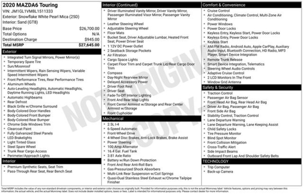 Recent Arrival! 2020 Mazda Mazda6 Touring SKYACTIV®-G 2.5L I4 DOHC 16V 6-Speed Automatic FWD 4D Sedan Snowflake White Pearl Mica Local Trade, AppLink/Apple CarPlay and Android Auto, Automatic temperature control, Exterior Parking Camera Rear, Front dual zone A/C, Heated front seats, Leatherette Seat Trim, MAZDA CONNECT Infotainment System Voice Command, Power door mirrors, Power driver seat, Power moonroof, Power windows, Radio: AM/FM/HD, Rain sensing wipers, Rear window defroster, Speed control, Tilt steering wheel, Wheels: 19" x 7.5J w/Gun Metallic Finish. 26/35 City/Highway MPG