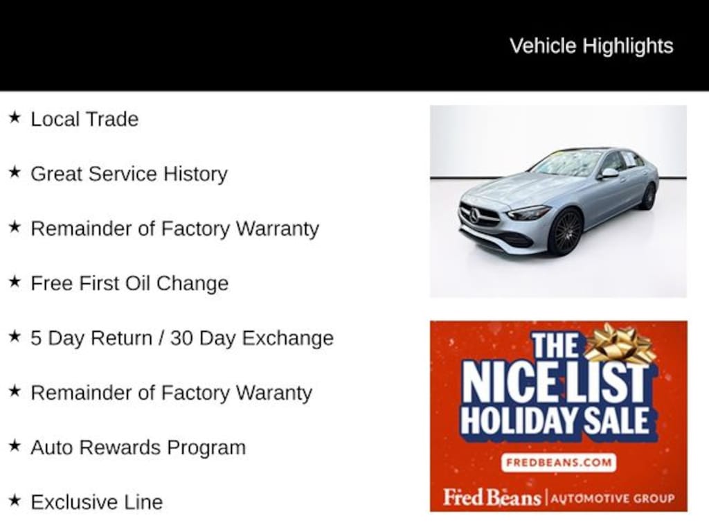 CARFAX One-Owner. Clean CARFAX. 23/33 City/Highway MPG 2022 Mercedes-Benz C-Class C 300 4MATIC® 2.0L I4 Turbocharged 9-Speed Automatic 4MATIC® 4D Sedan Cirrus Silver Metallic For better peace of mind all our used vehicles have a 127-point inspection and come with a 5-day return, 30-day exchange (As-Is vehicles are excluded). Our exclusive Auto Rewards Program provides better value with Free First Oil change, Free Pa State Safety inspections, discounts for local merchants and more. Plus, you can earn up to $2000 towards your next vehicle just by servicing with Fred Beans! As Fred Beans always says, our used cars are better because our reputation depends on it.