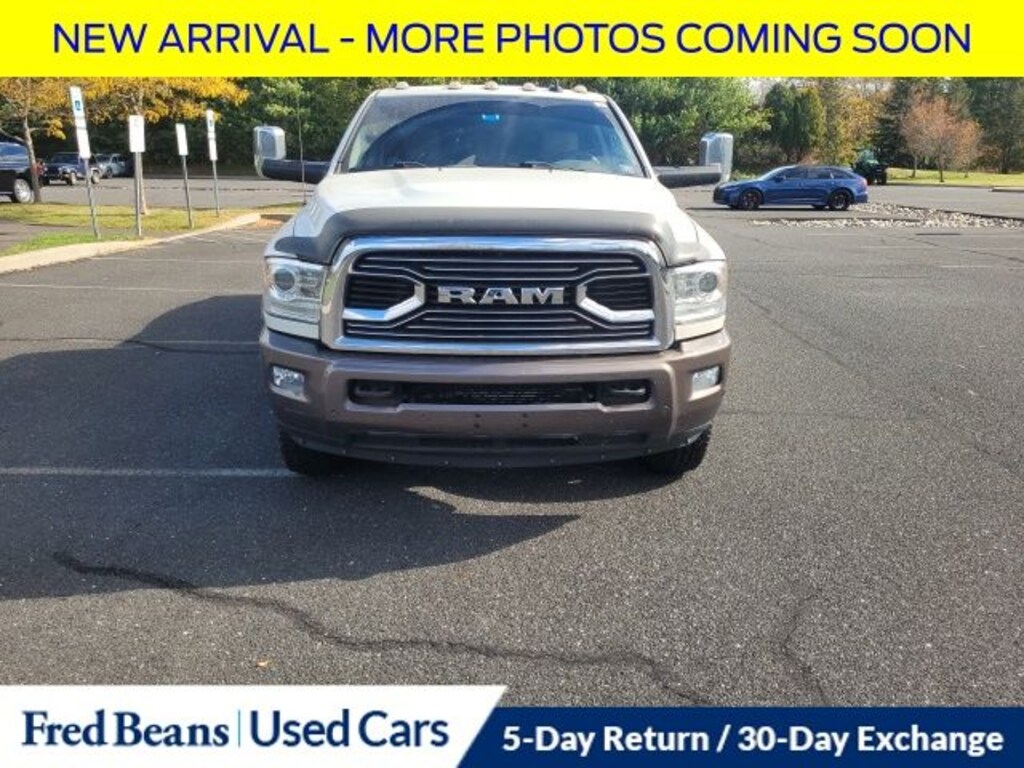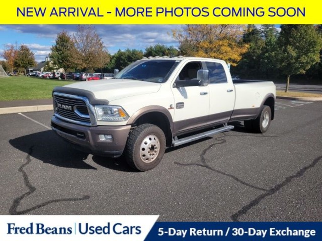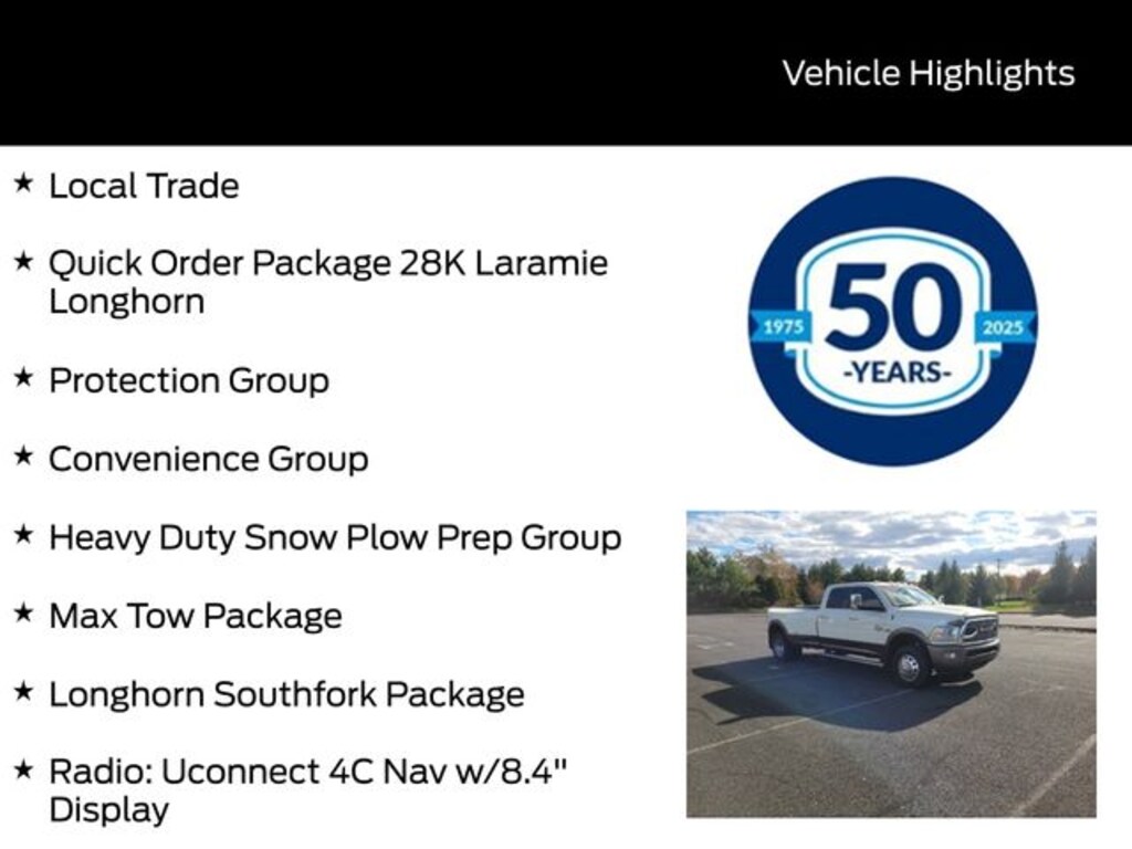 Recent Arrival! 2018 Ram 3500 Laramie Longhorn Cummins 6.7L I6 Turbodiesel Aisin 6-Speed Automatic 4WD 4D Crew Cab Pearl White Local Trade, 220 Amp Alternator, 4.10 Axle Ratio, 5th Wheel/Gooseneck Towing Prep Group, 6000# Front Axle w/Hub Ext, AM/FM radio: SiriusXM, Apple CarPlay/Android Auto, Auto High Beam Headlamp Control, Auto Level Rear Air Suspension, Automatic temperature control, Box & Rear Fender Clearance Lamps, Chrome Belt Moldings, Chrome Tubular Side Steps, Clearance Lamps, Convenience Group, CTR Stop Lamp w/Cargo View Camera, Dual Alternators Rated At 440 Amps, Dual Rear Wheel Fender Flare Tracking, Dual Rear Wheels, Front dual zone A/C, Front fog lights, Heated door mirrors, Heated Front Seats, Heated Second Row Seats, Heated Steering Wheel, Heavy Duty Snow Plow Prep Group, Leather Wrapped Grab Handle, Longhorn Southfork Package, Longhorn Tailgate Letters, Low Beam Daytime Running Headlamps, Luxury Front & Rear Floor Mats, Max Tow Package, MOPAR 30K Direct Mount 5th Wheel Hitch, ParkView Rear Back-Up Camera, Power 10-Way Memory Driver & 6-Way Passenger Seats, Power door mirrors, Power driver seat, Power passenger seat, Power Sunroof, Power windows, Protection Group, Quick Order Package 28K Laramie Longhorn, Radio: Uconnect 4C Nav w/8.4" Display, Rain Sensitive Windshield Wipers, Rear Window Defroster, Remote keyless entry, Speed control, Suede Headliner, Tire Pressure Monitoring Delete, Trailer Brake Control, Turn signal indicator mirrors, Ventilated Front Seats, Walnut Veneer I/P Center Stack Bezel, Wheels: 17" x 6.0" Premium Aluminum.